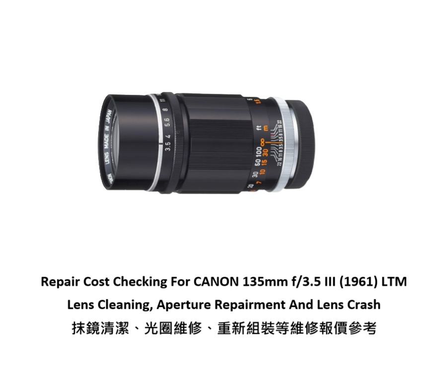 Repair Cost Checking For CANON 135mm f/3.5 III (1961) LTM Lens Cleaning, Aperture Repairment And Lens Crash 抹鏡清潔、光圈維修、重新組裝等維修報價參考