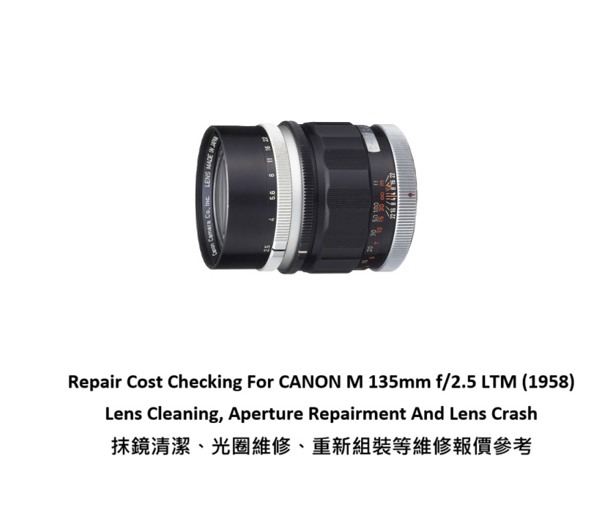 Repair Cost Checking For CANON M 135mm f/2.5 LTM (1958) Lens Cleaning, Aperture Repairment And Lens Crash 抹鏡清潔、光圈維修、重新組裝等維修報價參考
