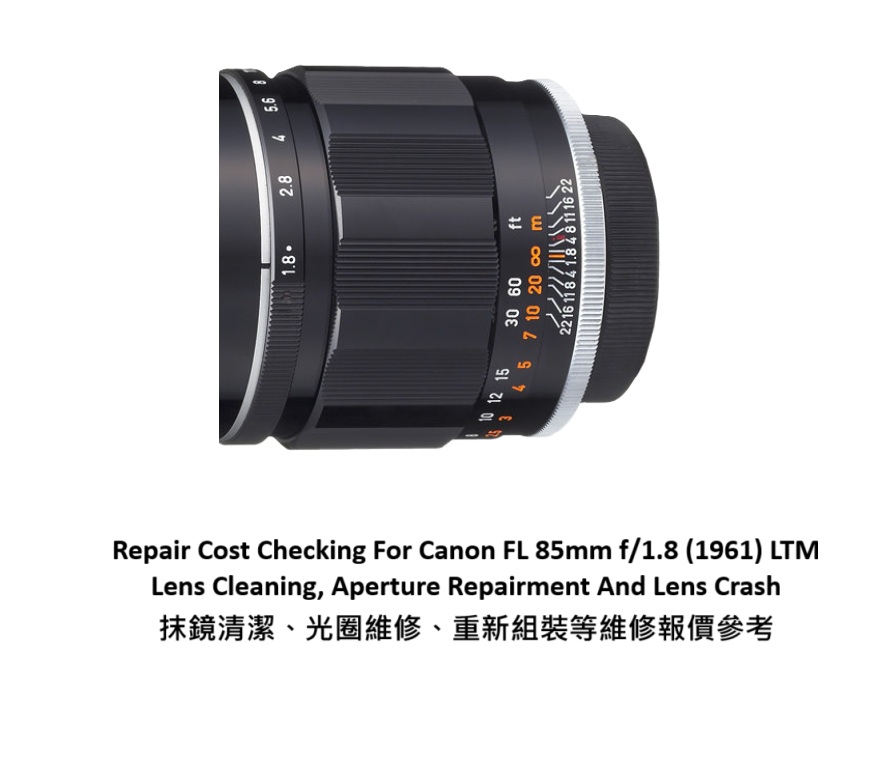 Repair Cost Checking For Canon FL 85mm f/1.8 (1961) LTM Lens Cleaning, Aperture Repairment And Lens Crash 抹鏡清潔、光圈維修、重新組裝等維修報價參考