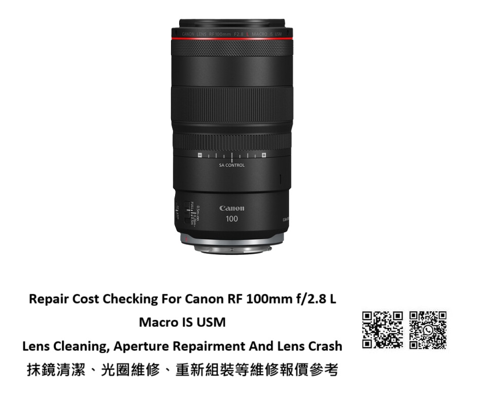 Repair Cost Checking For Canon RF 100mm f/2.8 L Macro IS USM Lens Cleaning, Aperture Repairment And Lens Crash 抹鏡清潔、光圈維修、重新組裝等維修報價參考