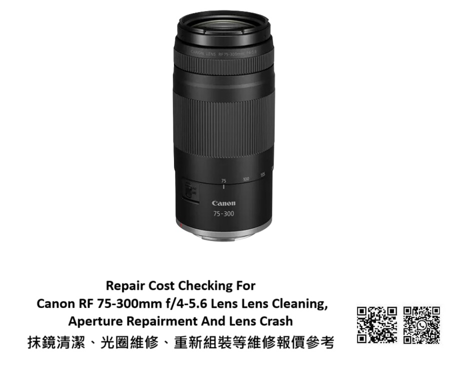 Repair Cost Checking For Canon RF 75-300mm f/4-5.6 Lens Lens Cleaning, Aperture Repairment And Lens Crash 抹鏡清潔、光圈維修、重新組裝等維修報價參考