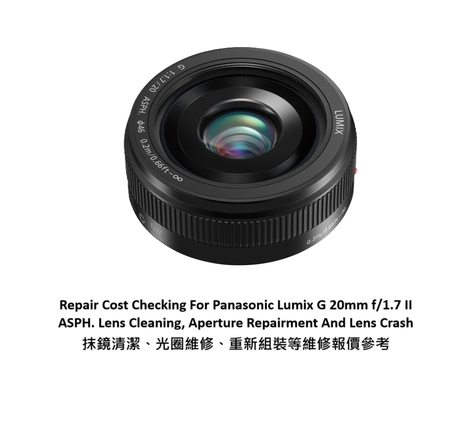 Repair Cost Checking For Panasonic Lumix G 20mm f/1.7 II ASPH. Lens Cleaning, Aperture Repairment And Lens Crash 抹鏡清潔、光圈維修、重新組裝等維修報價參考