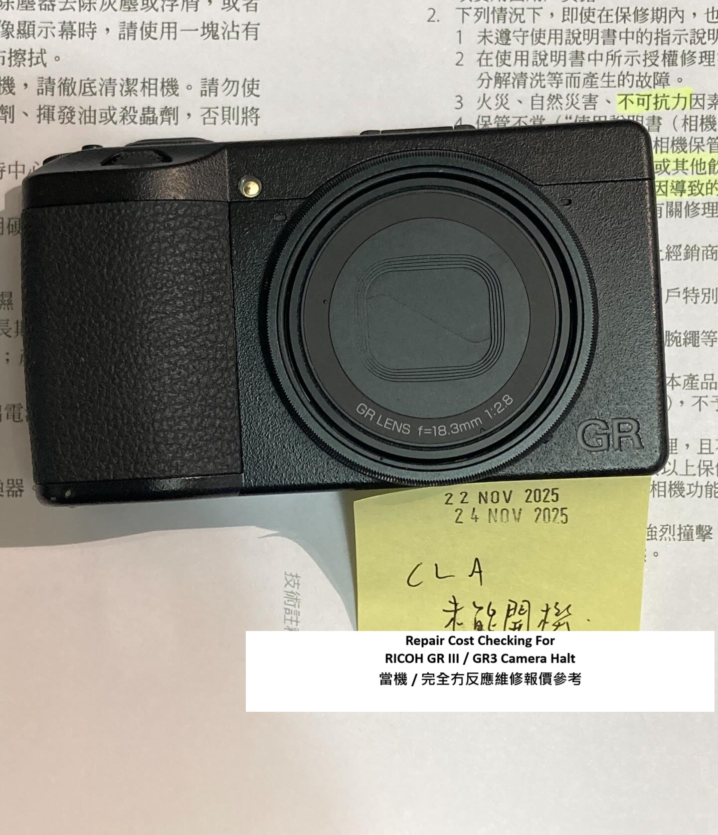 Repair Cost Checking For RICOH GR III / GR3 Camera Halt 當機 / 完全冇反應維修報價參考