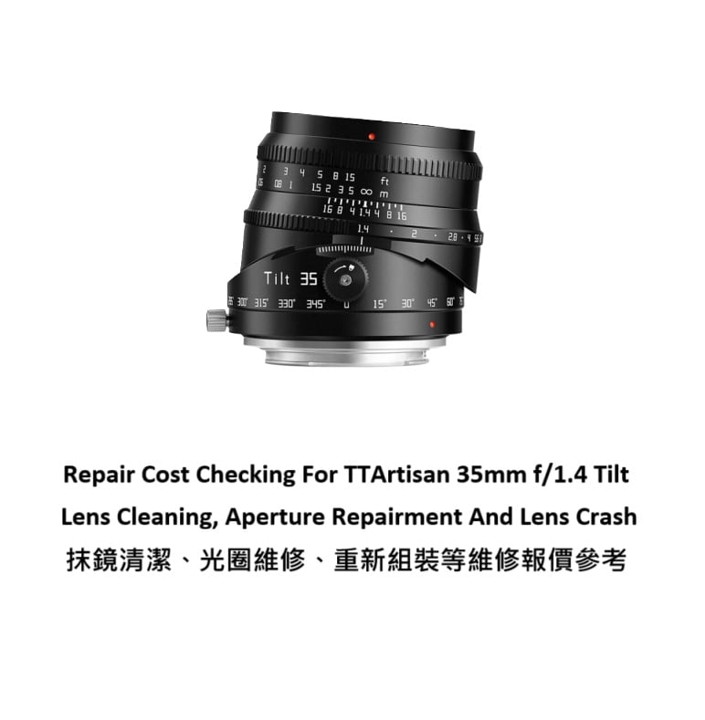 Repair Cost Checking For TTArtisan 35mm f/1.4 Tilt Lens Cleaning, Aperture Repairment And Lens Crash 抹鏡清潔、光圈維修、重新組裝等維修報價參考