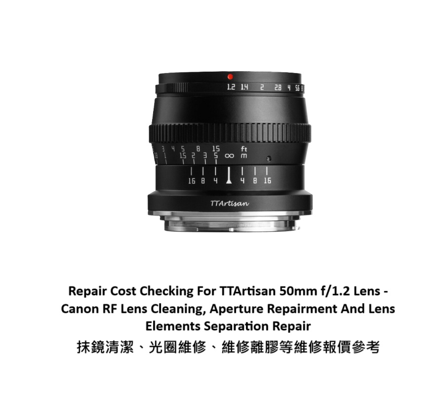 Repair Cost Checking For TTArtisan 50mm f/1.2 Lens - Canon RF Lens Cleaning, Aperture Repairment And Lens Elements Separation Repair 抹鏡清潔、光圈維修、維修離膠等維修報價參考