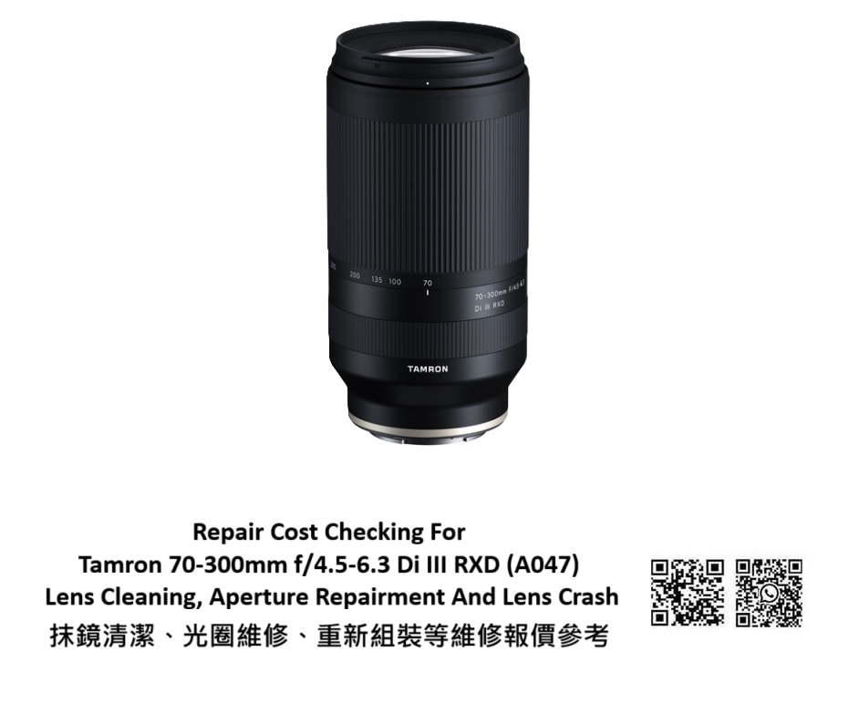 Repair Cost Checking For Tamron 70-300mm f/4.5-6.3 Di III RXD (A047) Lens Cleaning, Aperture Repairment And Lens Crash 抹鏡清潔、光圈維修、重新組裝等維修報價參考